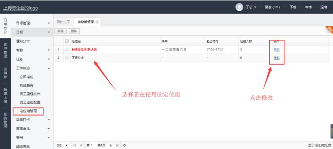 选择日常办公-工作轨迹-定位组管理,选择需要修改的定位组,点击修改。