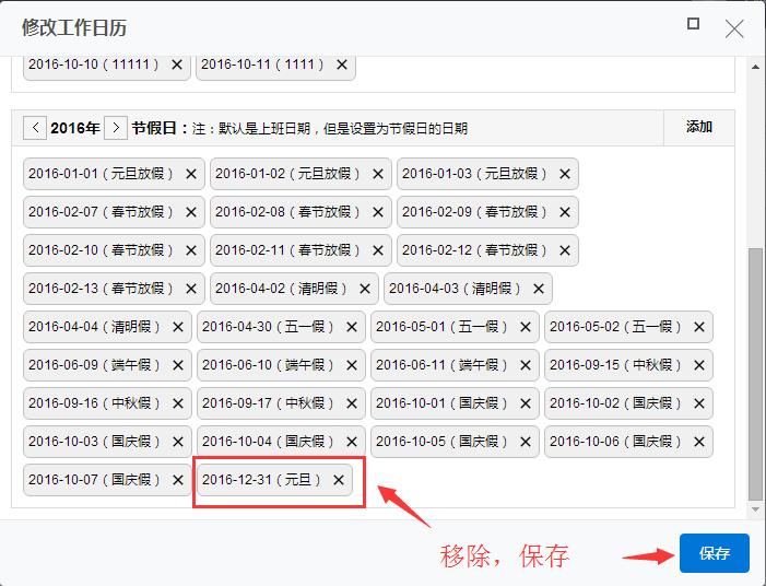 4、在“节假日”一栏,找到需要定位的节假日,点击叉号移除,然后保存。