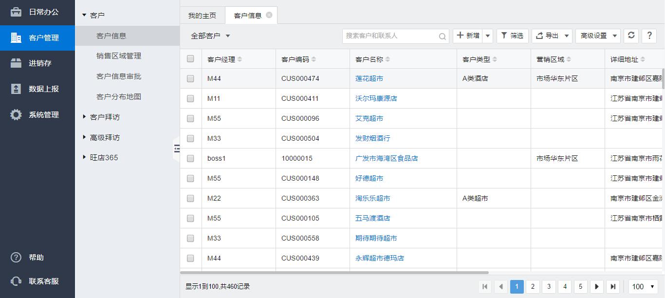 【客户信息管理】用以管理及维护客户信息。该模块提供按照客户名称、助客户类型、区域、客户经理、添加起止时间等检索条件来查询客户信息的检索功能;并提供新增、导入、导出、修改、删除以及日志功能。