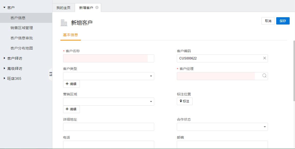 新增客户注意必填项带“*”是否填全,否则无法保存;