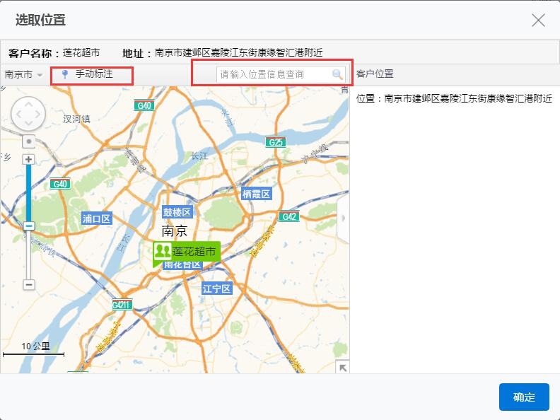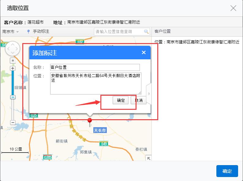 2)模糊查询位置信息后,选择客户的地址,点击确定完成标注。