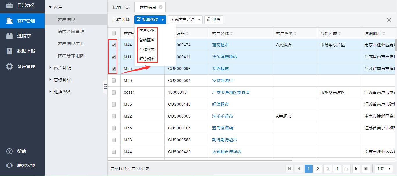 2)批量修改客户信息,勾选多个客户信息,选择“批量修改—修改字段”; 批量修改选中,根据需要修改对应修改的字段;