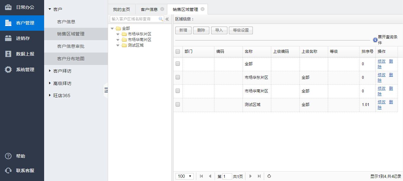 【区域管理】用以管理及维护客户的区域信息,以便于管理本企业的客户信息。该模块提供、新增、修改、删除相关功能,树形结构展示,以更形象的展示客户区域各级关系,以便系统管理员维护。