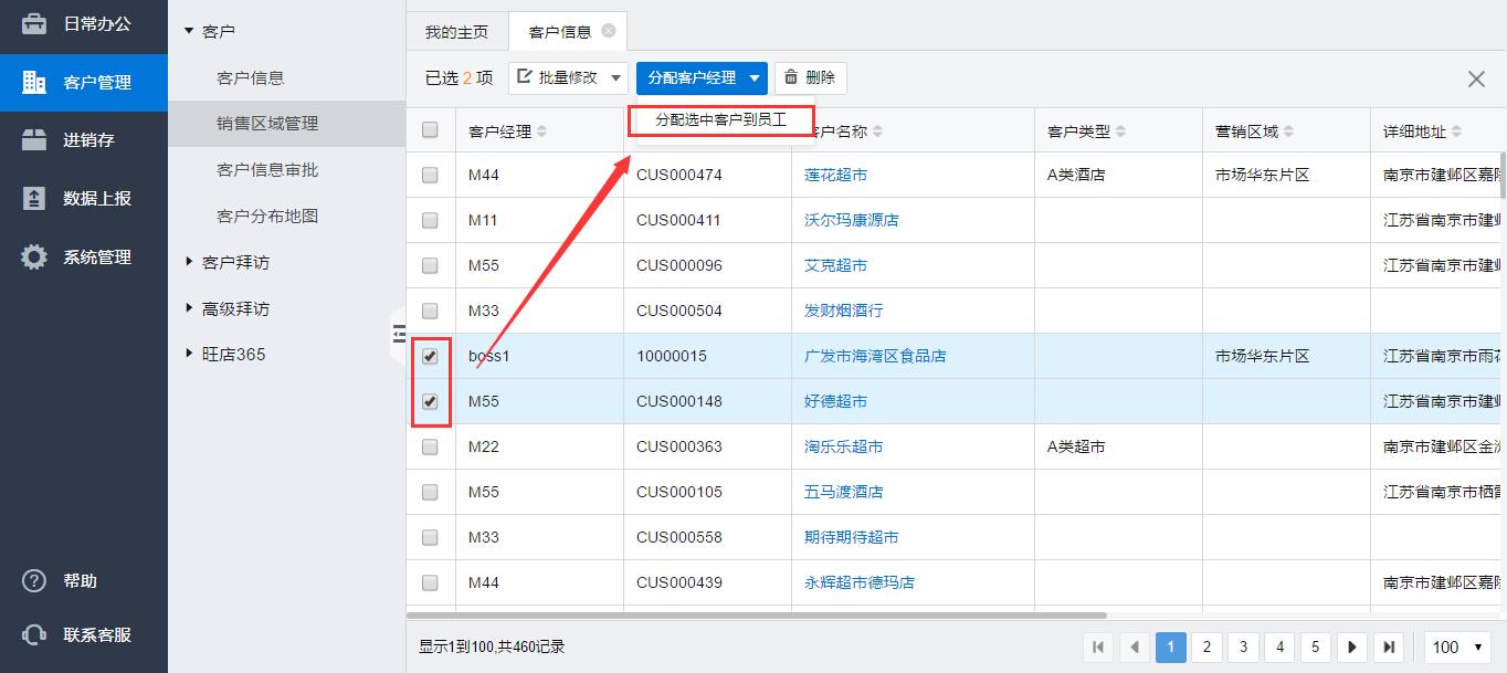 【分配客户经理】勾选中客户后点击客户经理,将单个或多个客户分配给单个或多个客户经理。
