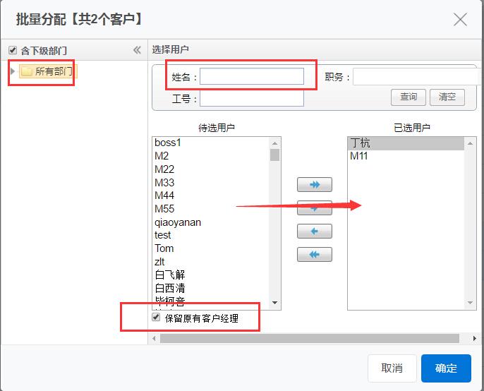 通过选择部门架构或者搜索客户经理,选择到已选用户;同时是否保留原有客户经理 默认√ 选择;