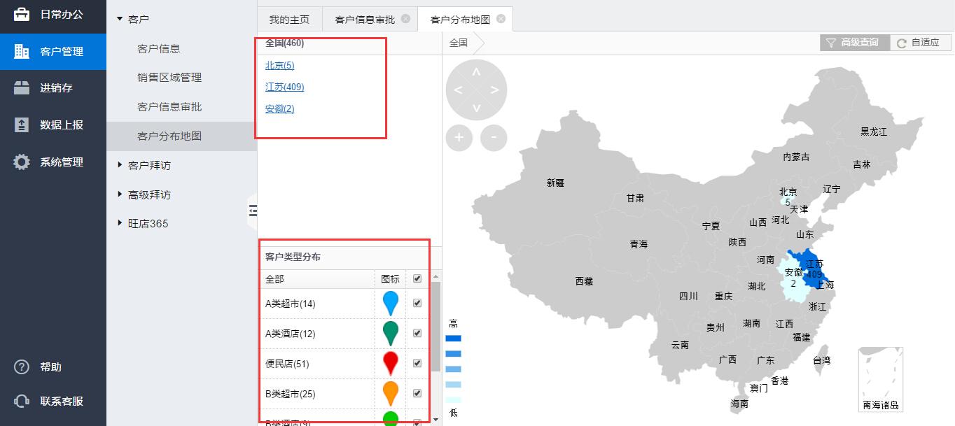 【客户分布情况】以地图的形式形象直观的展现客户分布信息。提供按找客户区域、客户类型、客户名称等检索条件来精准查看客户的分布位置信息。