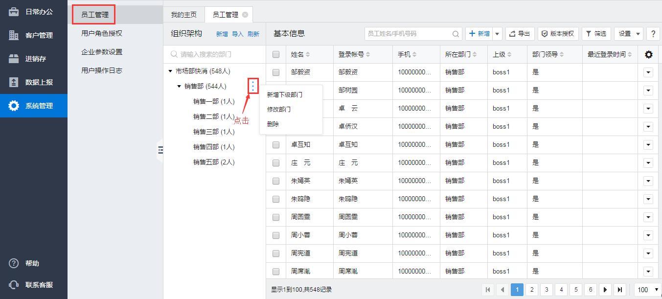 鼠标移到部门名称上,点击更多按钮,出现新增下级部门、修改部门和删除。