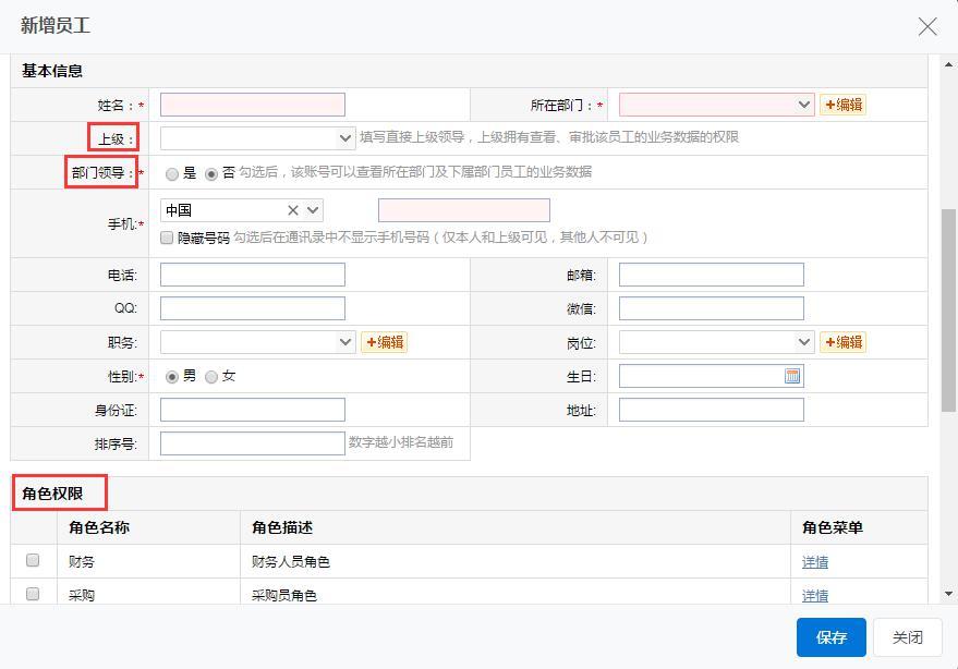 角色权限:每一个账号都必须勾选一个角色,角色权限的作用是控制该账号显示哪些功能菜单以及查看数据的范围。