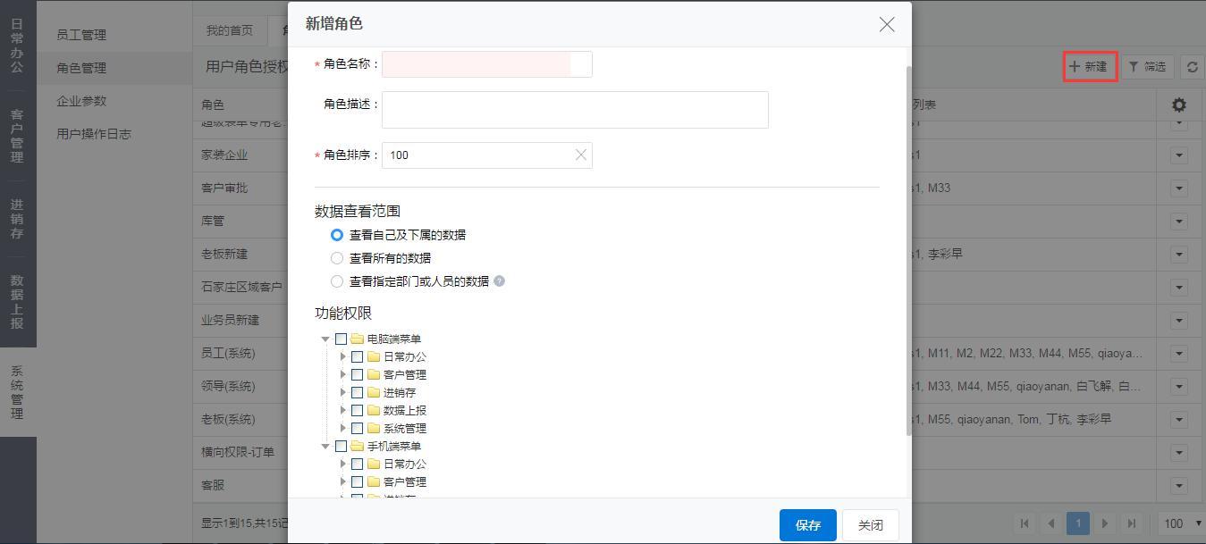 通过新增角色来控制企业人员可见功能权限和查看数据的范围。