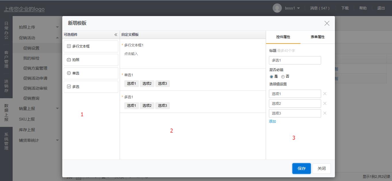 新增模板操作方法:将图示1中的组件拖至图示2,编辑图示3中的空间属性及表单属性。点击保存即可完成模板新增。