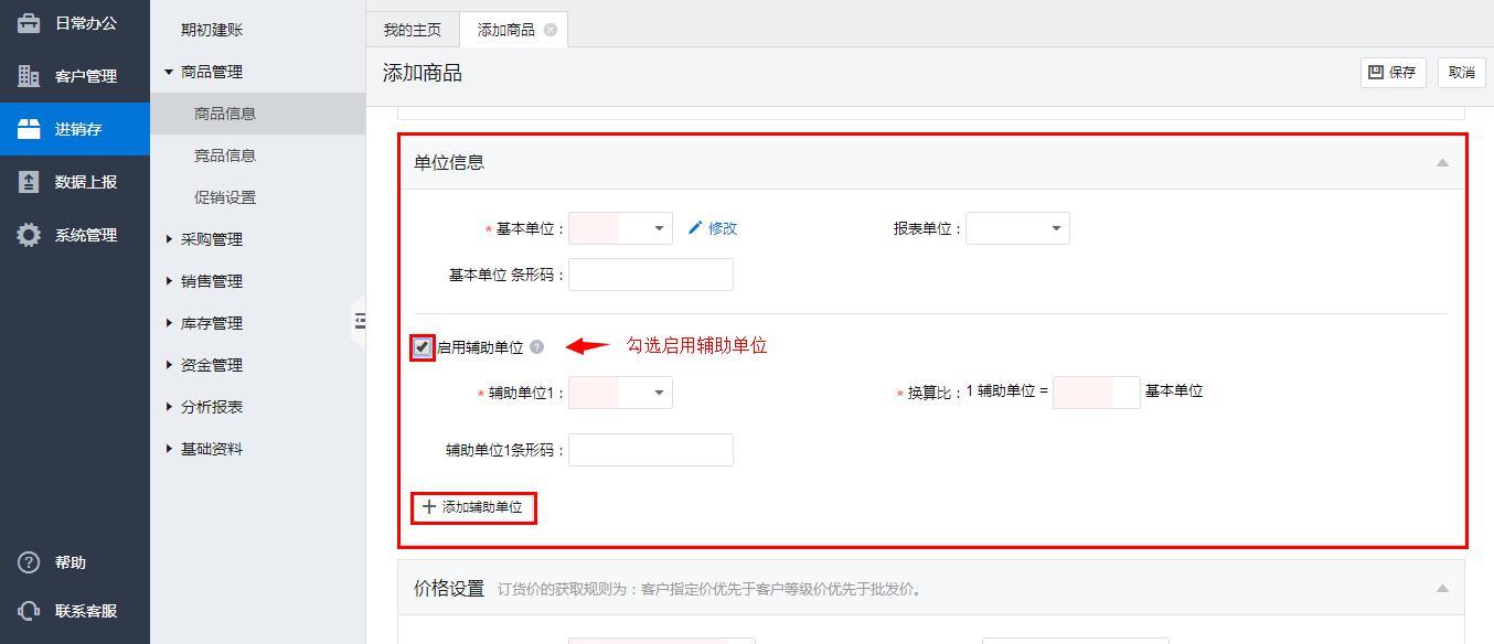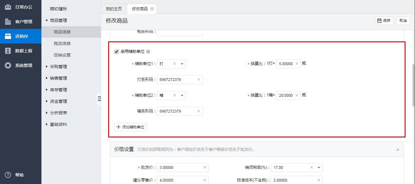注:默认是阶梯性的辅助单位,此时商品单位换算比必须是正整数,如需要使用非整数的大小包装单位,可以找客户经理调整参数(如有类似1袋=6.25克,1箱=20.58斤);被使用过的单位不允许删除,不允许修改换算比; 辅助单位用过不能修改,否则影响库存等。