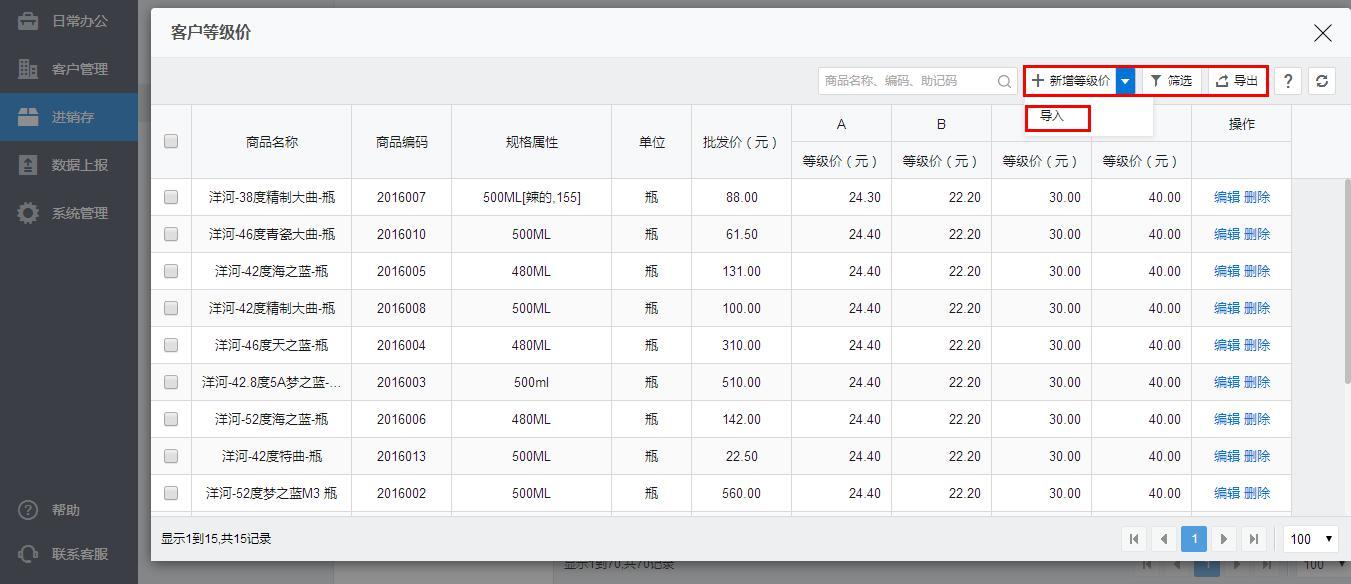 注:批量更新客户等级对应的商品等级价(不会更新客户等级折扣率),且更新后不能撤回,导入时候对应商品等级价格为空,会把原来等级价重置为批发价。
