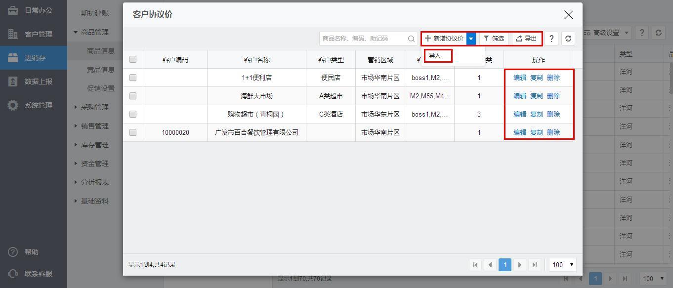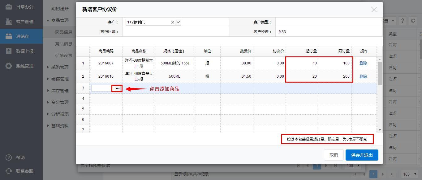 选择客户后点击添加商品输入协议价、起订量、限定量