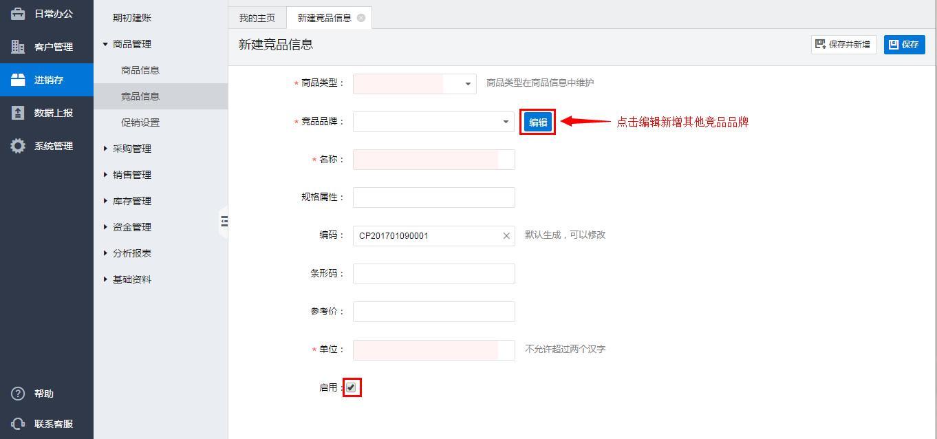 录入商品类型、竞品品牌、名称、单位等,若不勾选启用,则该竞品为停用状态。