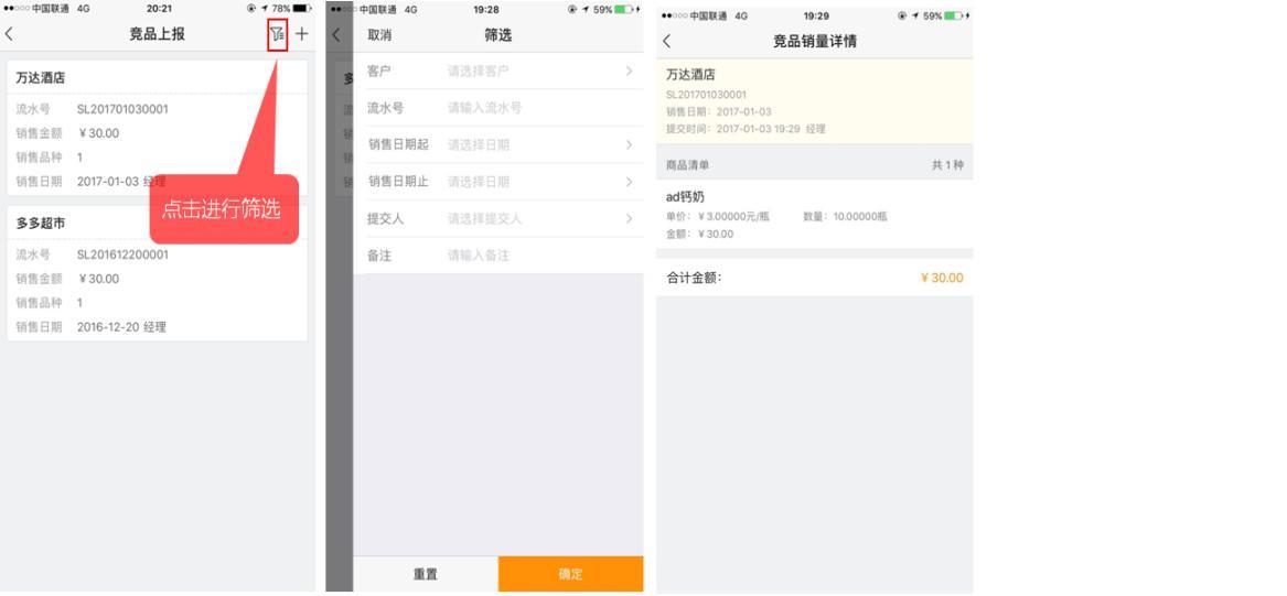 支持按客户、流水号、销售日期起、止、提交人、备注进行筛选