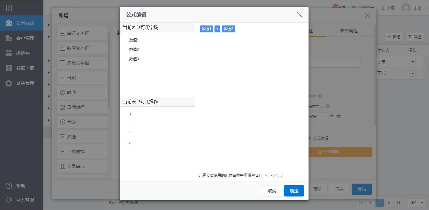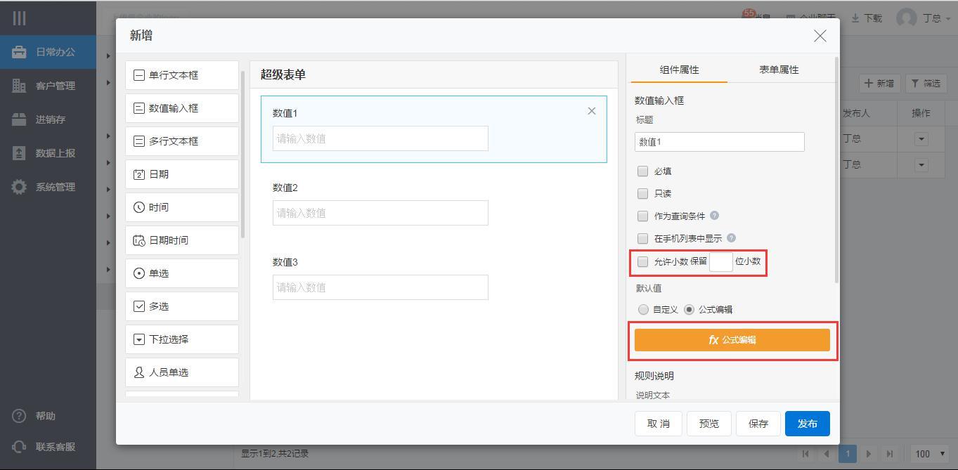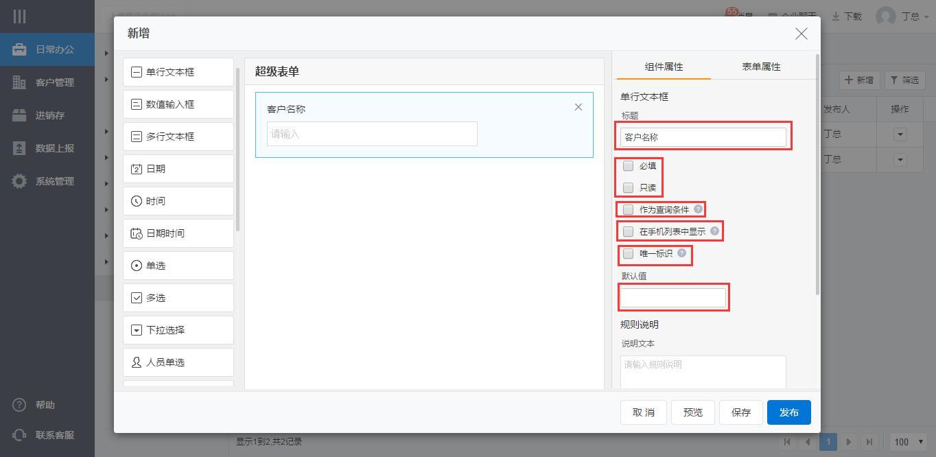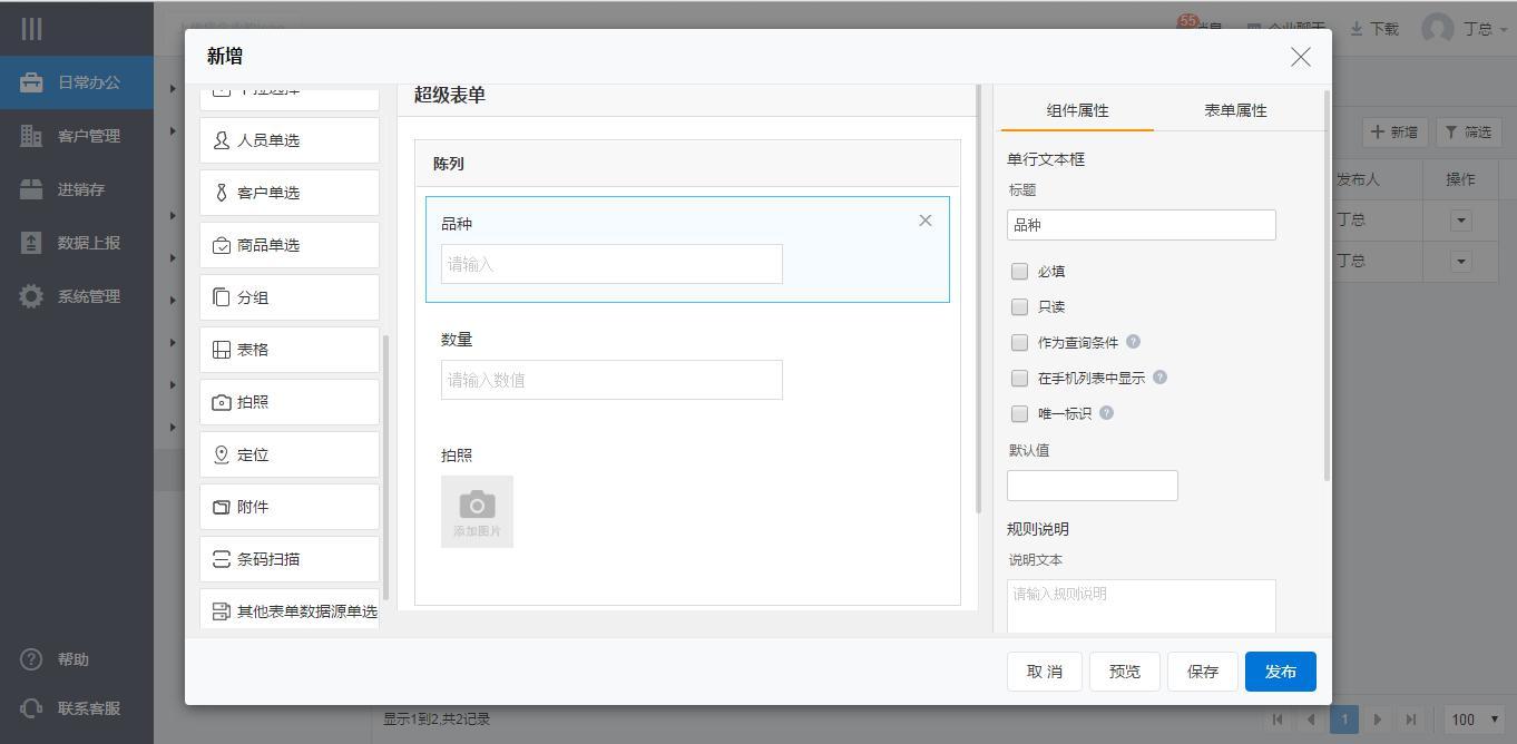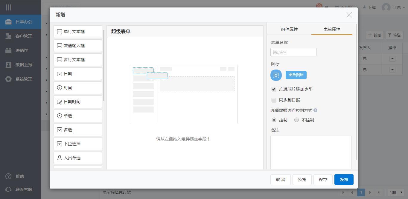进入表单定义界面,提供了近20种组件,供企业选择。