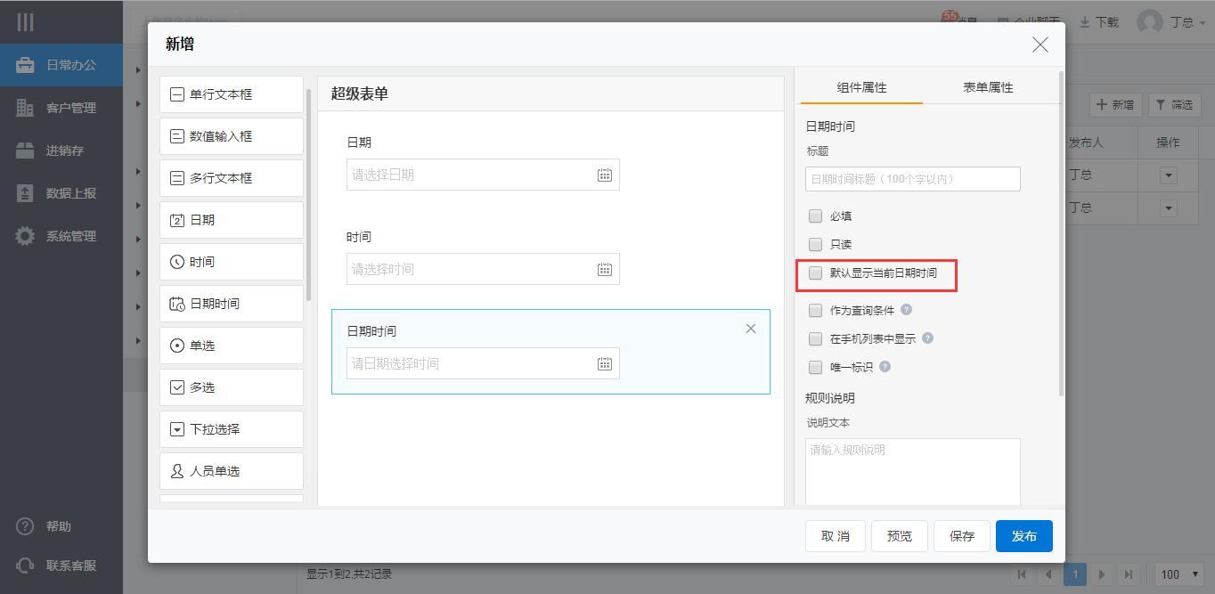 提供日期、时间、日期时间三种组件,可以设置默认显示当前的日期或时间。