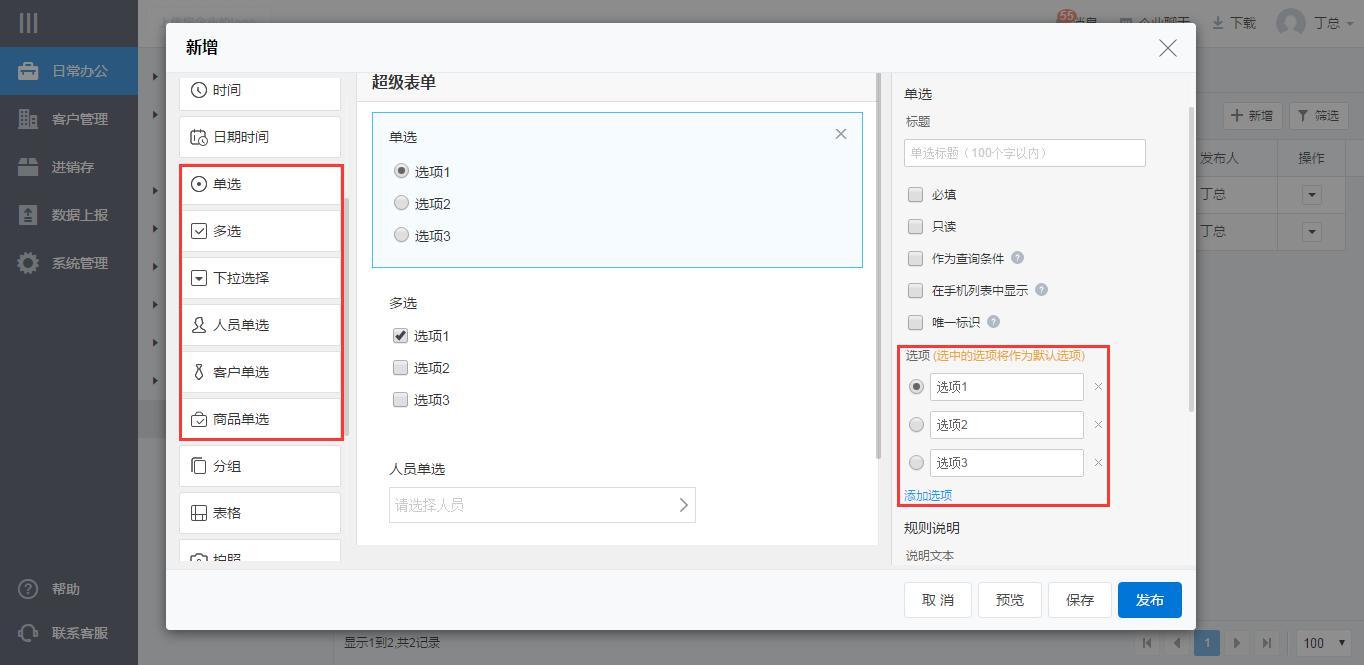 选择组件包含单选、多选、下拉选择、人员单选、客户单选、商品单选。单选、多选和下拉选择框支持添加自定义选项,当选项超过30个时,在手机端操作时支持模糊搜索。