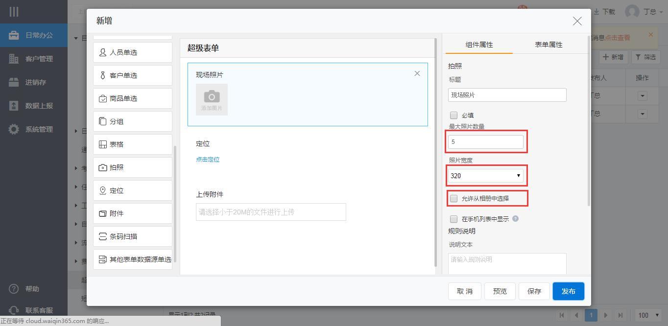 拍照组件可以在表单内实现采集照片,支持设置照片数量、大小以及是否允许从相册选择,定位组件可以实现实时位置的获取,附件组件支持上传照片、文档等文件,注意:附件大小应小于20M,苹果手机不支持上传附件。