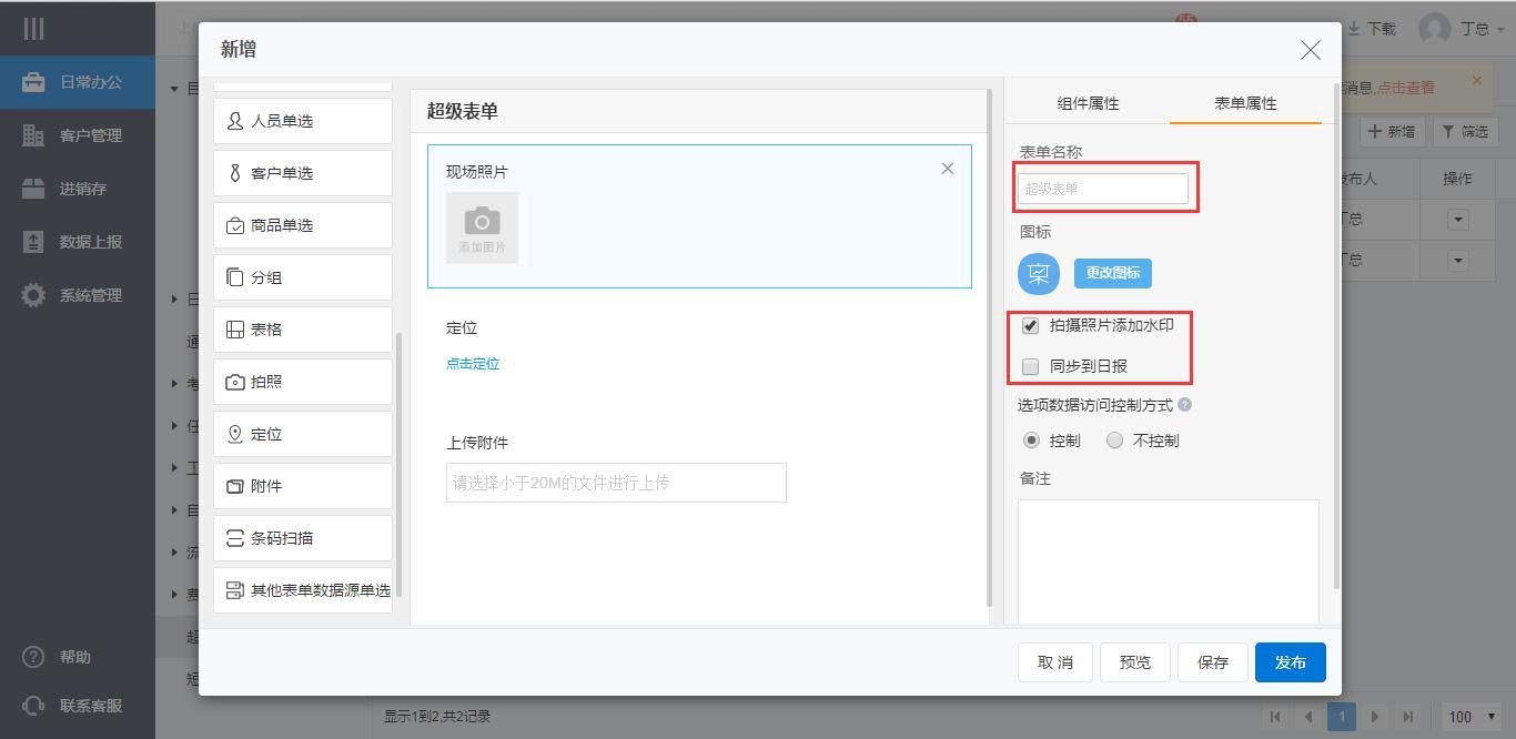 可以自定义表单的名称、图标。设置拍照组件在拍照时是否添加水印以及在表单提交时是否同步到日报。