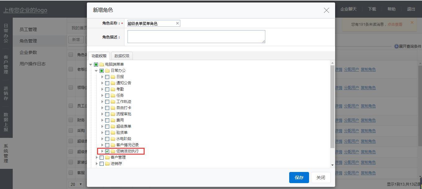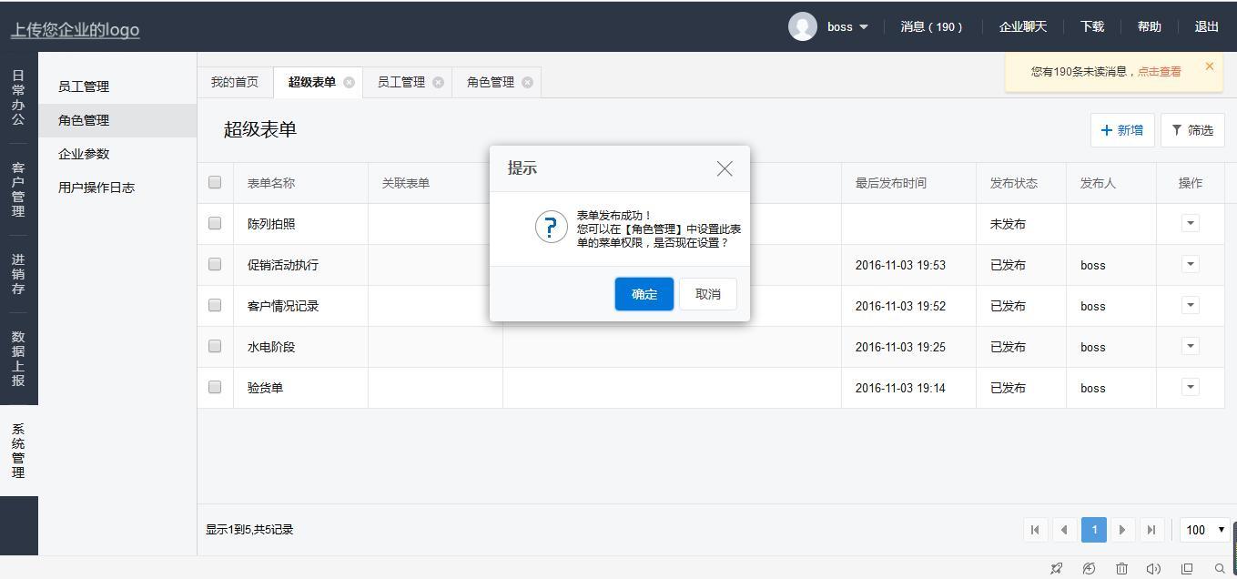 后台在超级表单配置好后点击“发布”,这个表单就可以分配使用了。发布好的表单需要在角色管理里设置菜单权限,如下图,点击确定进入角色管理界面。