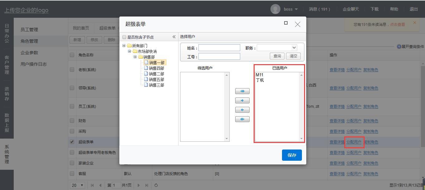 角色添加好后,找到刚刚新增的角色,点击分配用户,选择需要使用此菜单的员工,点击保存,即可授权对应员工使用此菜单。