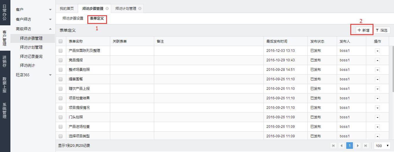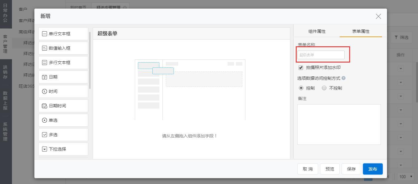 在左侧菜单栏中点击【客户管理】-【高级拜访】-【拜访步骤管理】,选择【表单定义】来定义表单内容,我们提供了19种控件供选择。注:此处表单定义和超级表单设置操作一致,故不在此赘述。