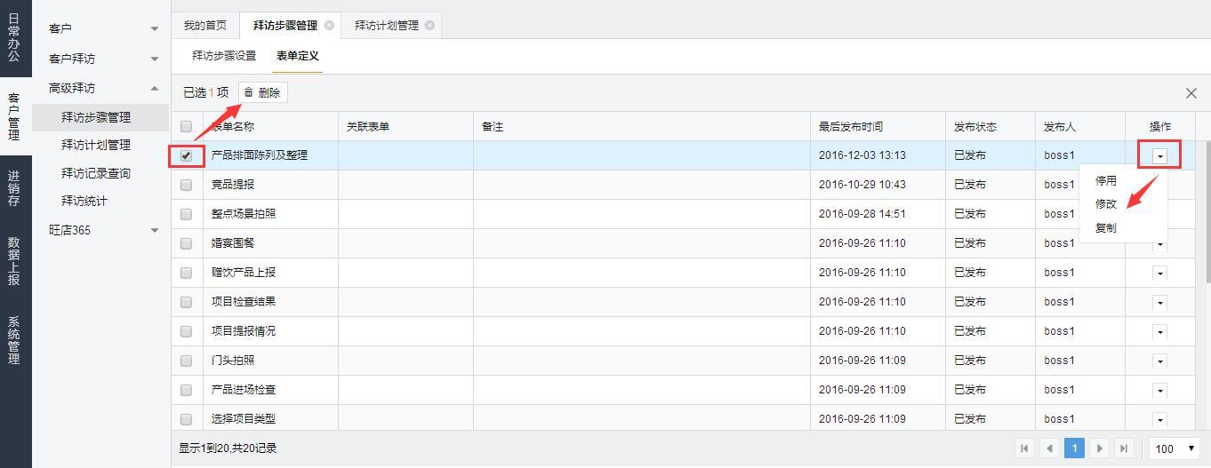 对已发布的表单可进行复制、修改、停用和删除操作。