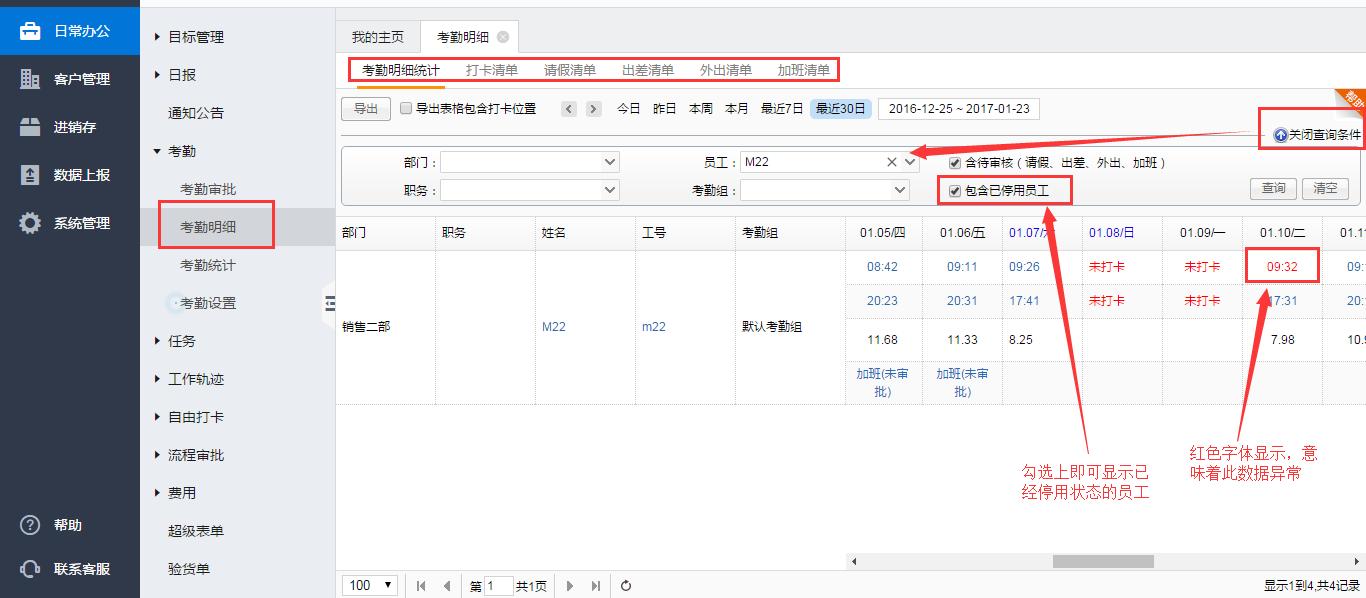 注:如果需要查看已停用账号的考勤情况,需要将包含已停用员工勾选