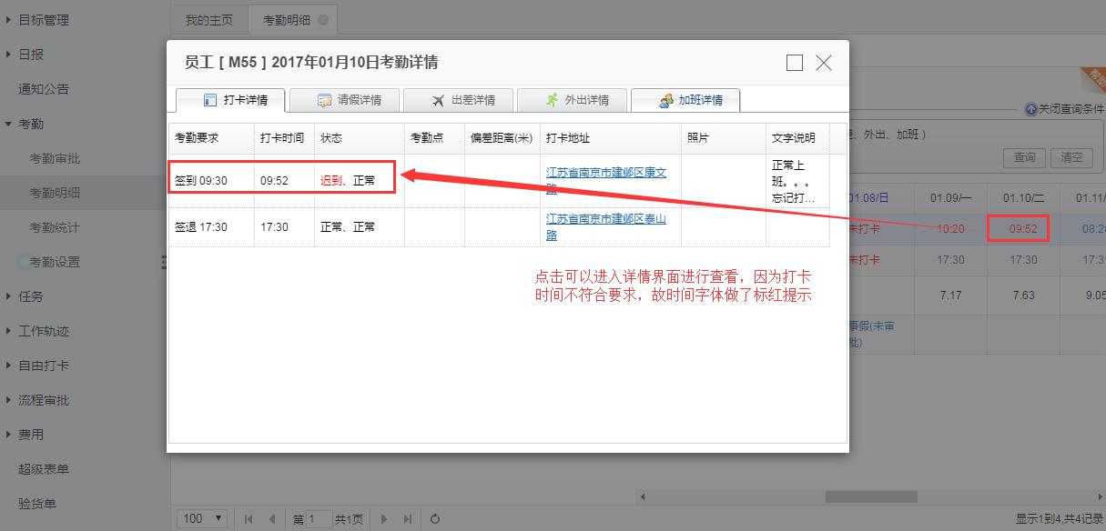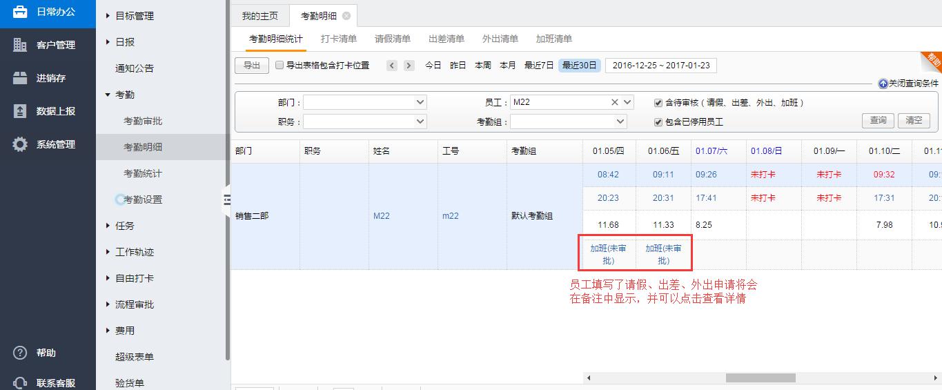 考勤明细中可以将考勤打卡、请假、出差、外出、加班清单显示出来,可以通过条件进行筛选,点击时间进去可以看到详细的打卡情况,如果有提交请假、出差、外出申请没有打卡的,将会在备注中显示出来。