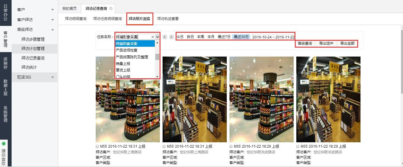 点击【拜访照片浏览】,可查看自己和下属拜访中上传的照片,支持导出。注意:导出界面没有全选,并且默认单次导出多支持200张。