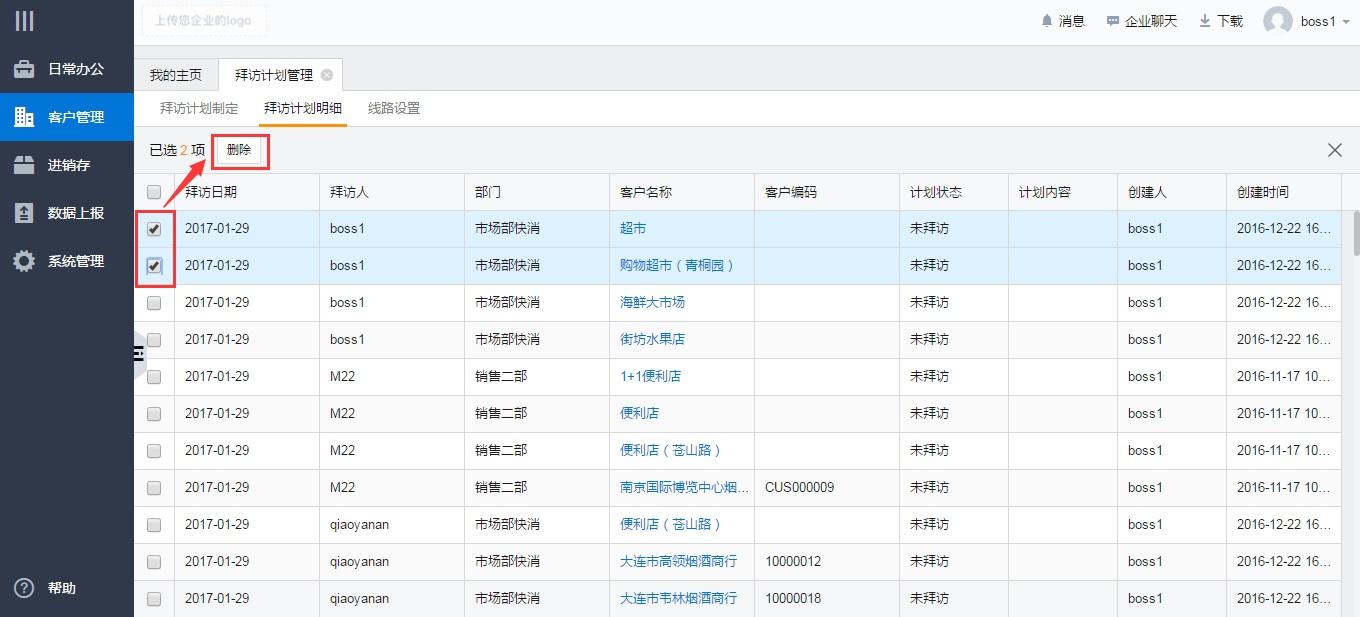 A:高级拜访计划删除必须要计划制定人来操作,在拜访计划明细中通过筛选找到想要删除的计划,选中之后删除即可。