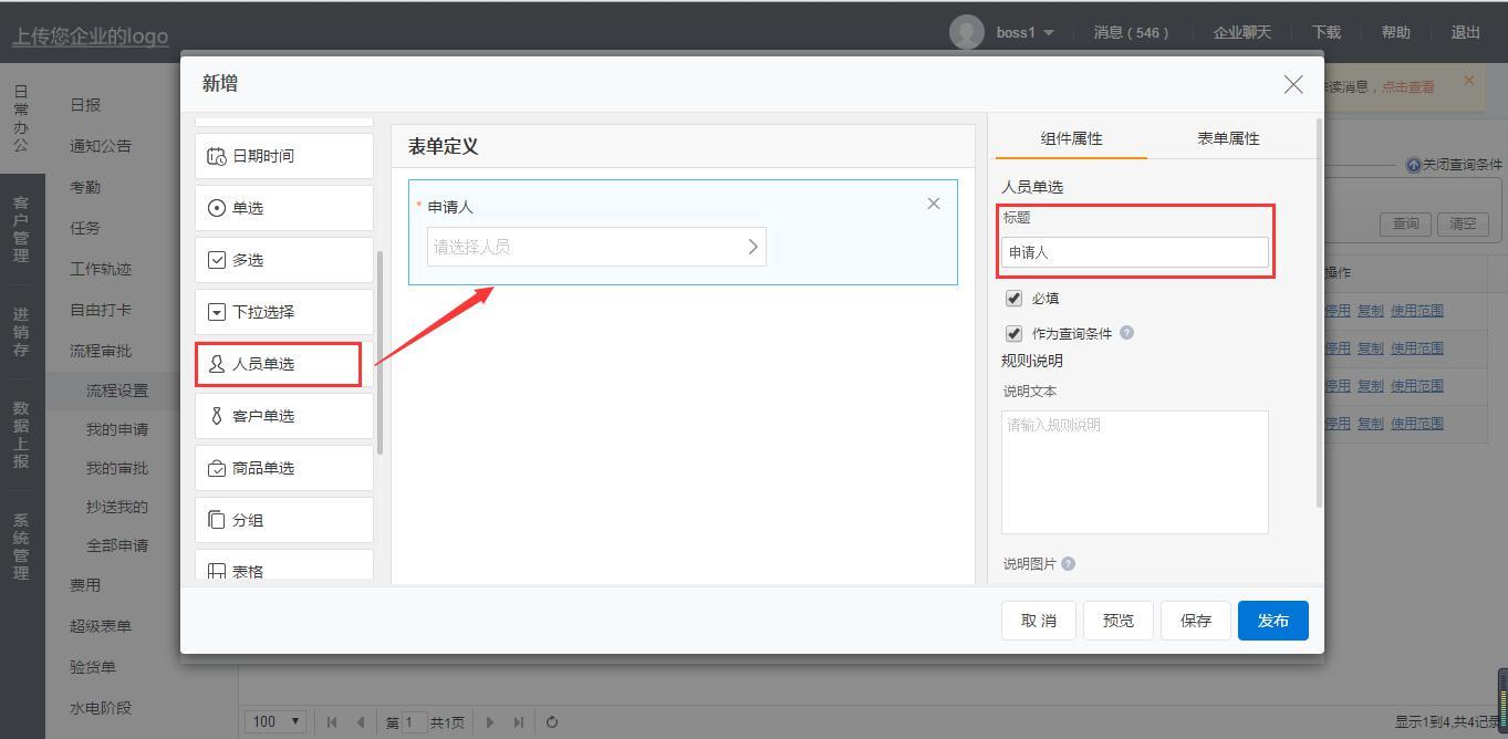 【申请人】内容填写的是公司员工姓名,所以可以借助人员单选控件直接选择,直接拖动,更改控件名称为申请人: