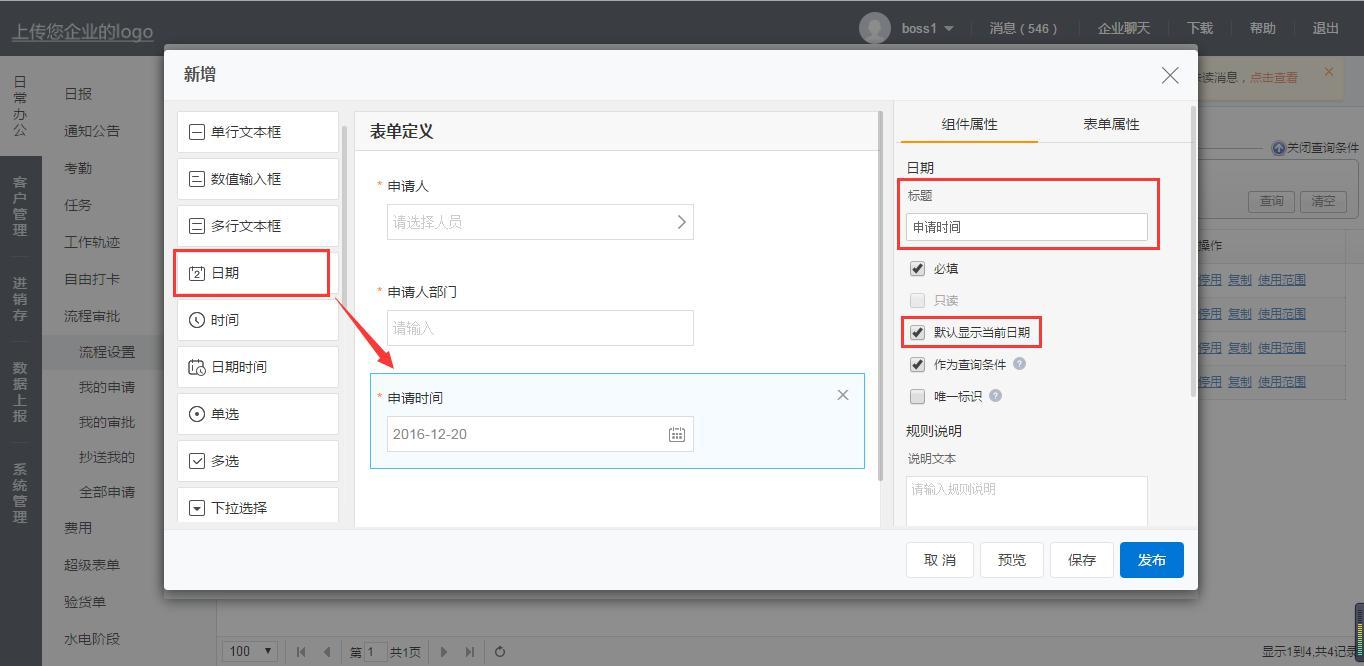 【申请时间】内容填写的是员工提交申请的日期,可以使用日期控件,可以设置默认显示的是当前日期,也可以自行修改: