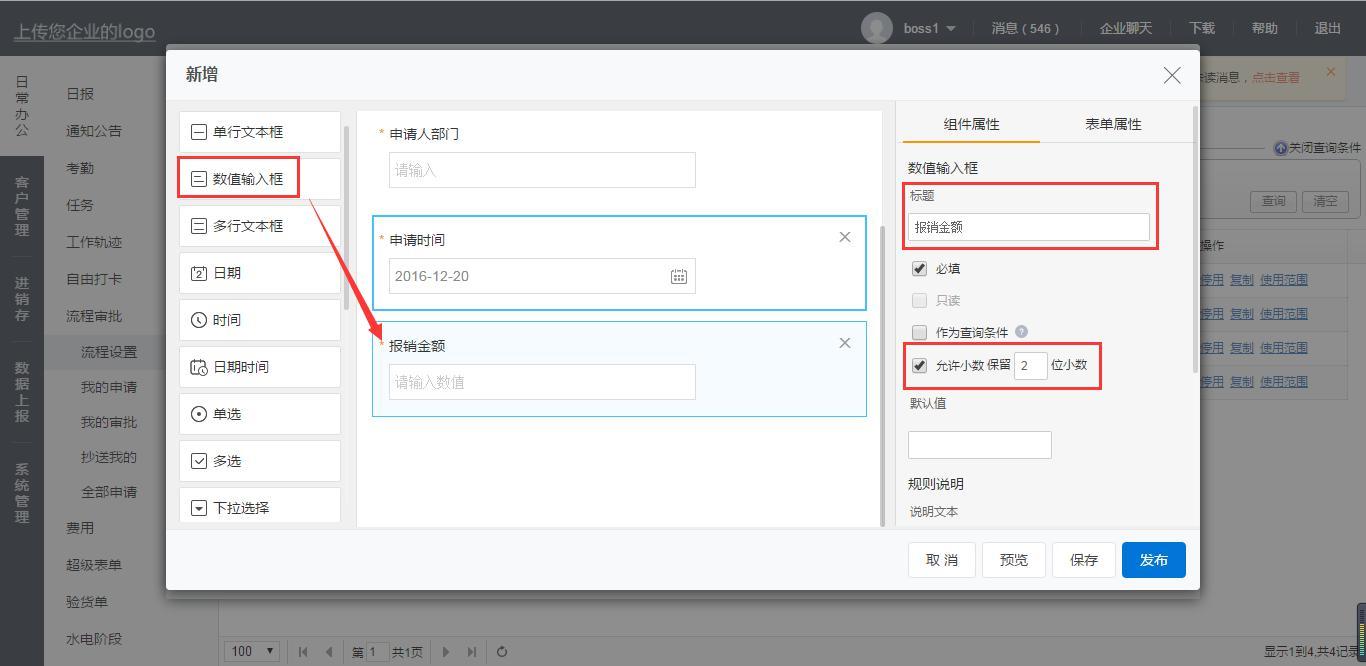【报销金额】内容填写的是员工所要报销的费用金额,可以使用数值输入框让员工自行填写,可以设置小数位数,这里先设置2位: