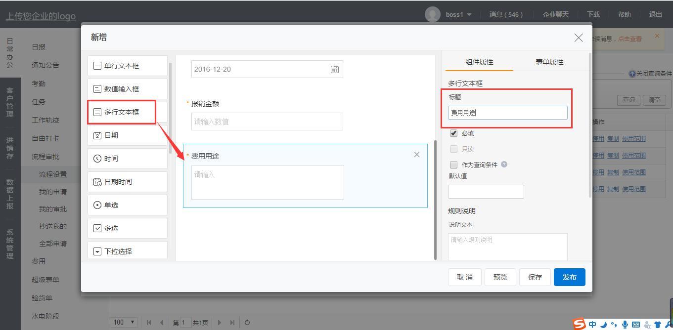 【费用用途】内容填写的是员工所报销费用的具体用途,可以使用文本输入框,让员工自行填写,这里先使用多行文本输入框: