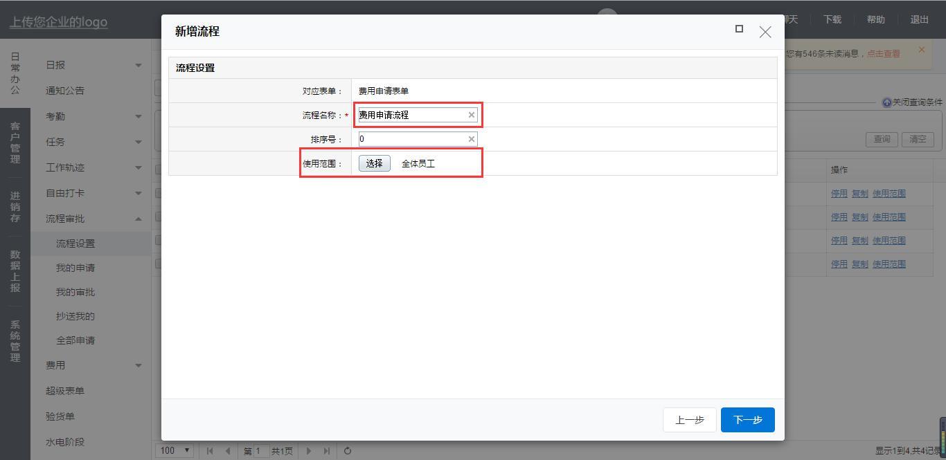 先给流程命名,然后选择流程的使用范围,可以设置全体员工、限定部门或者指定人员: