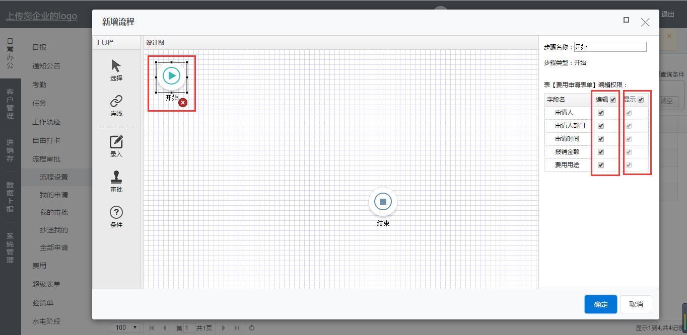 如图所示,首先是第一个节点【开始】,是申请提交开始录入的节点,在右侧可以设置具体字段是否显示、是否可编辑: