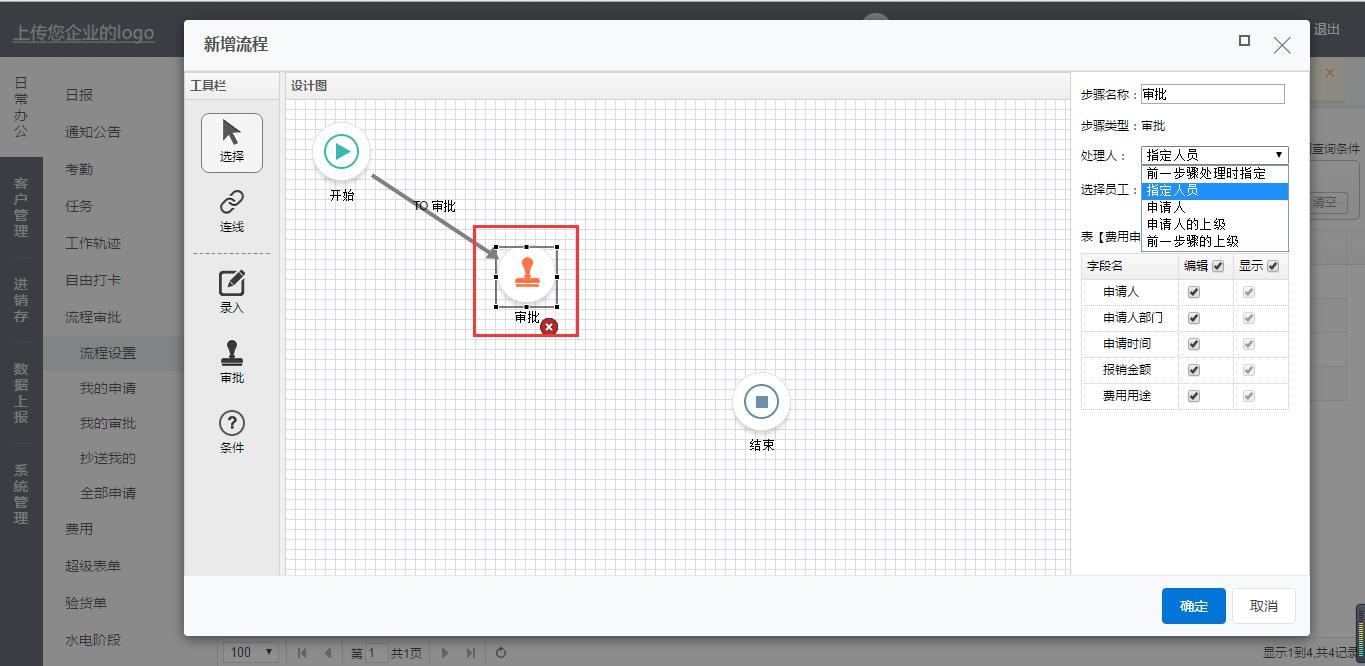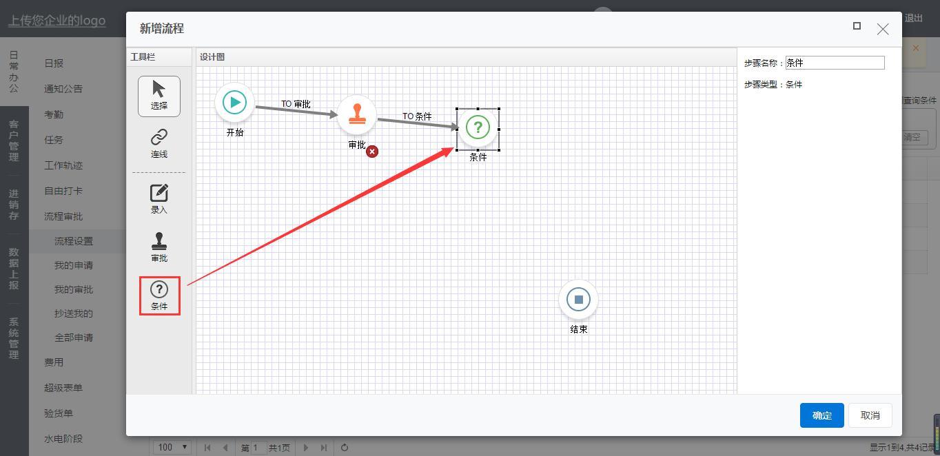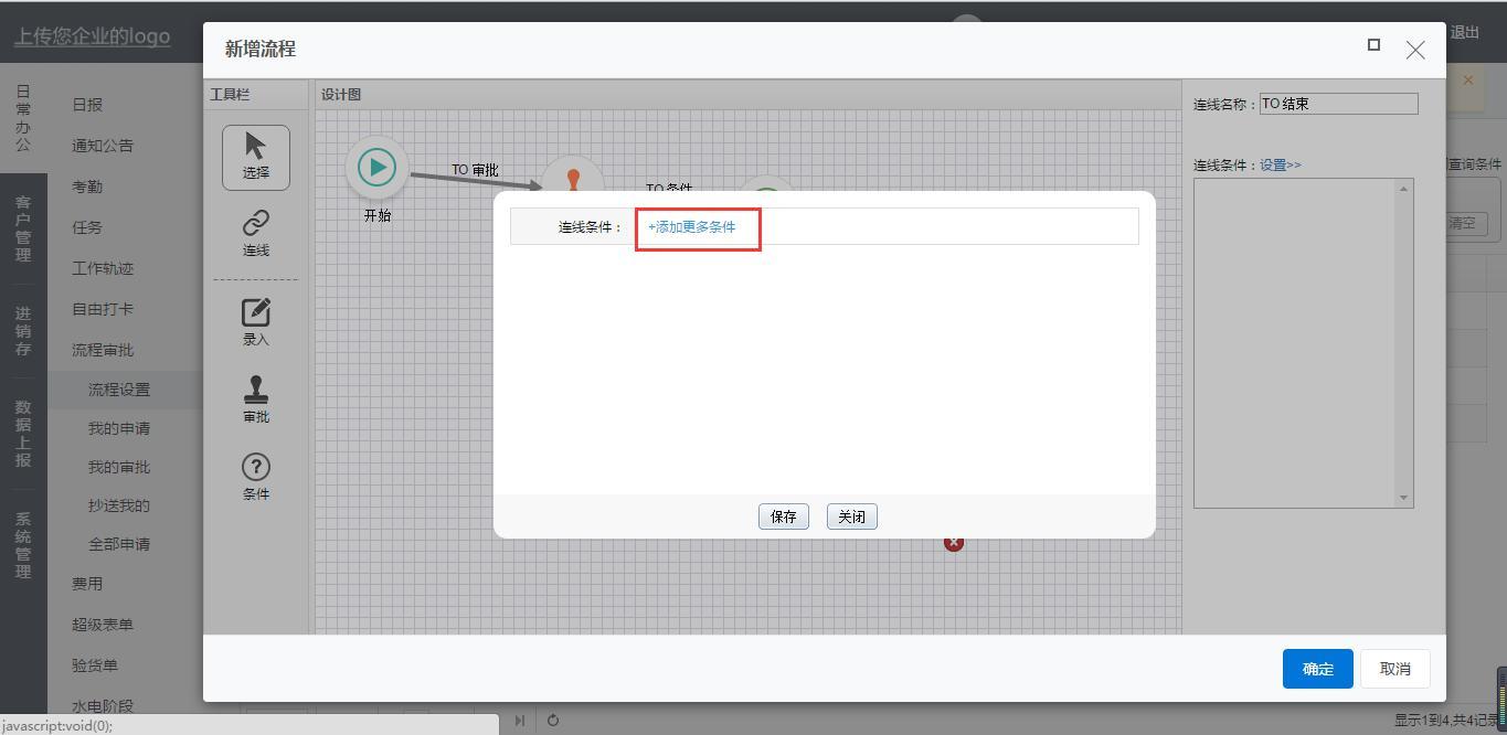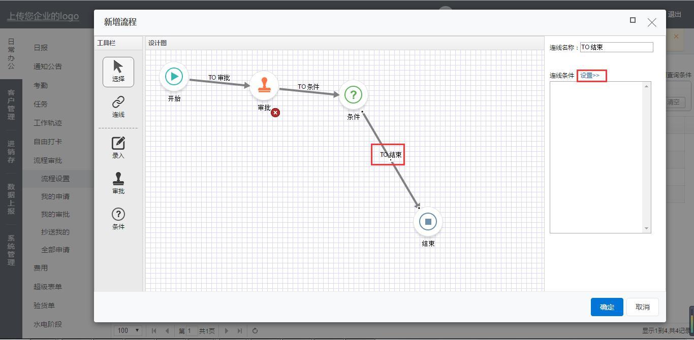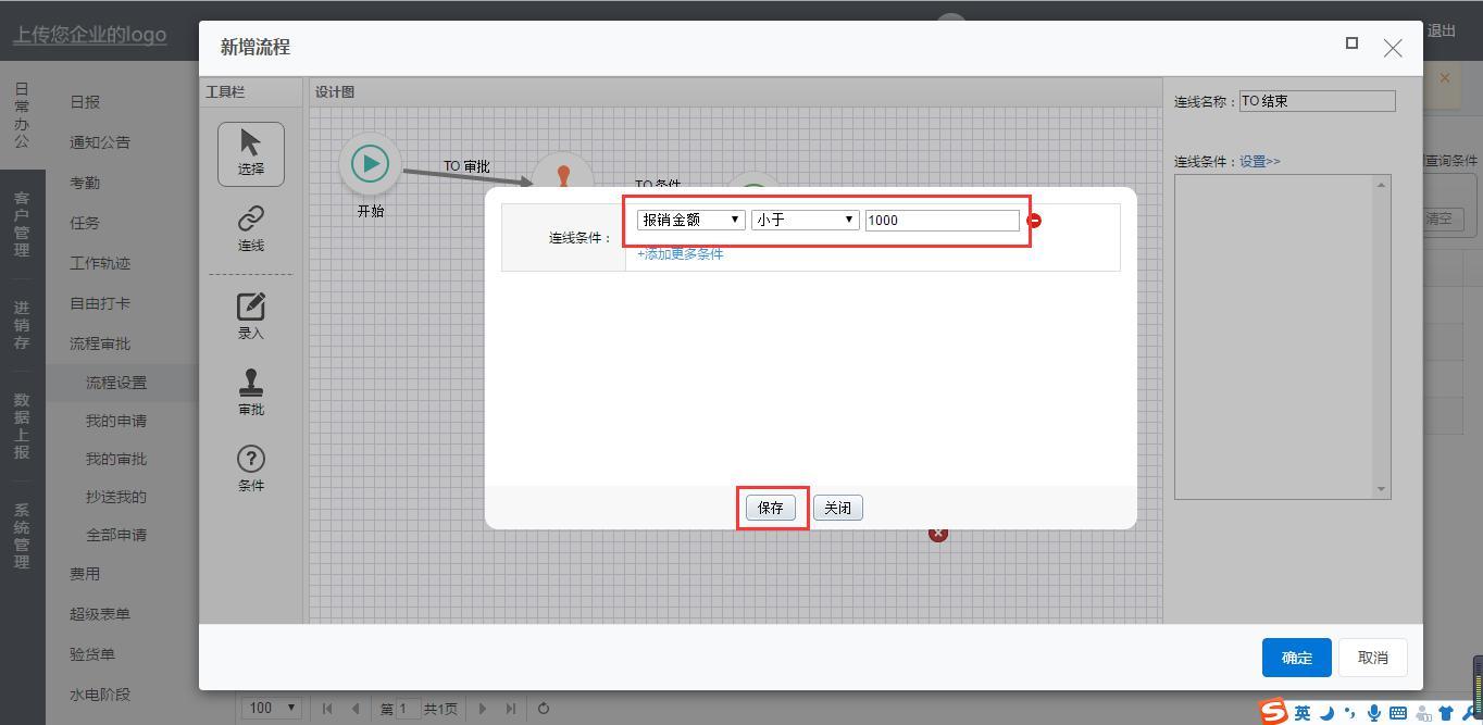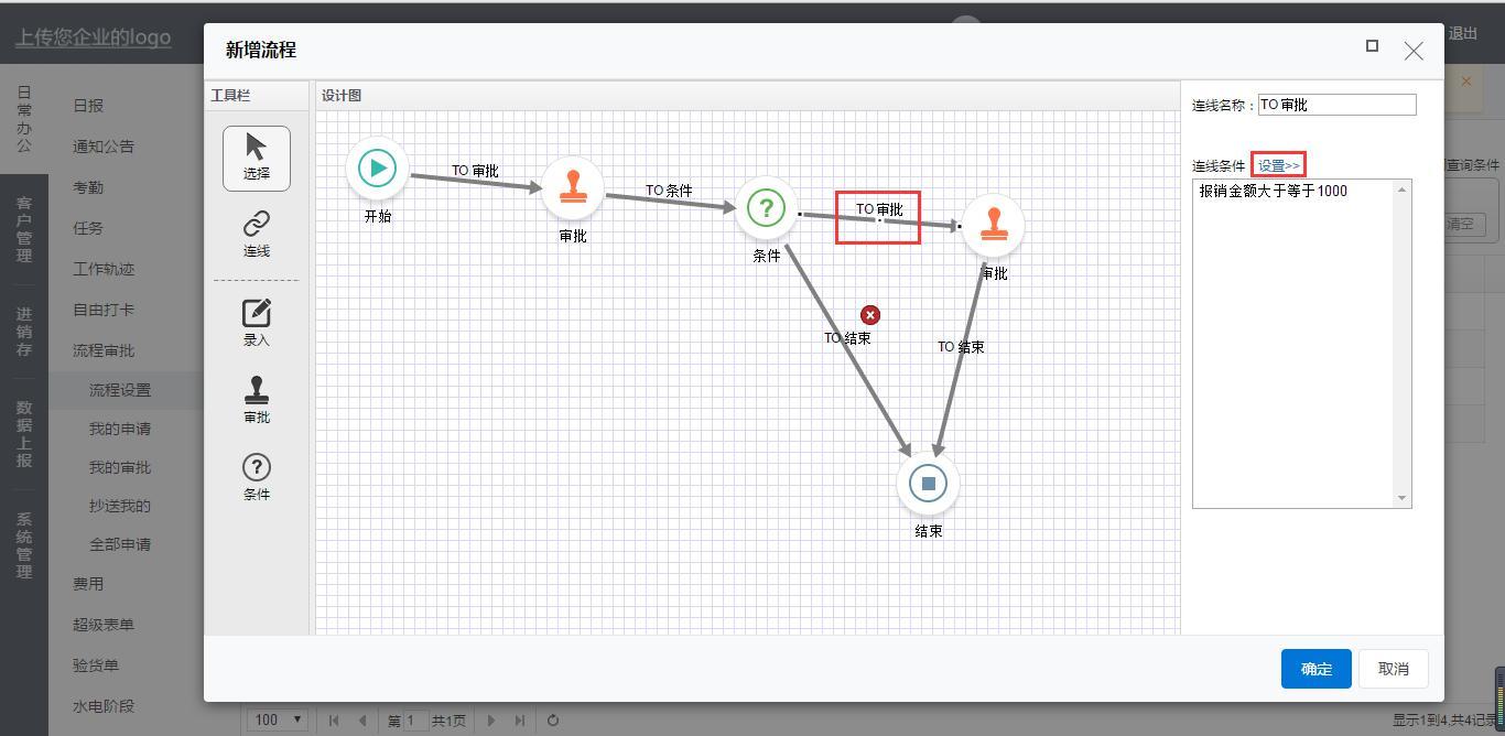 对于报销金额大于等于1000的由老板审批再结束。同理从条件连线到审批再到结束。连线条件设置报销金额大于等于1000。