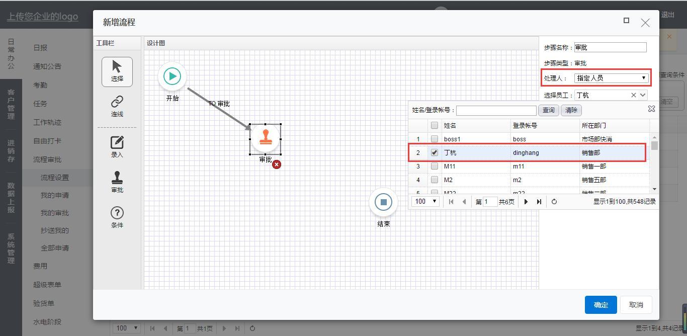 接下来设置审批人,选中【审批节点】在右侧处理人处选择审批人(可以设置如图显示不同的类型的审批人,我们所设置的流程选择的是指定人员,然后选择指定的员工)