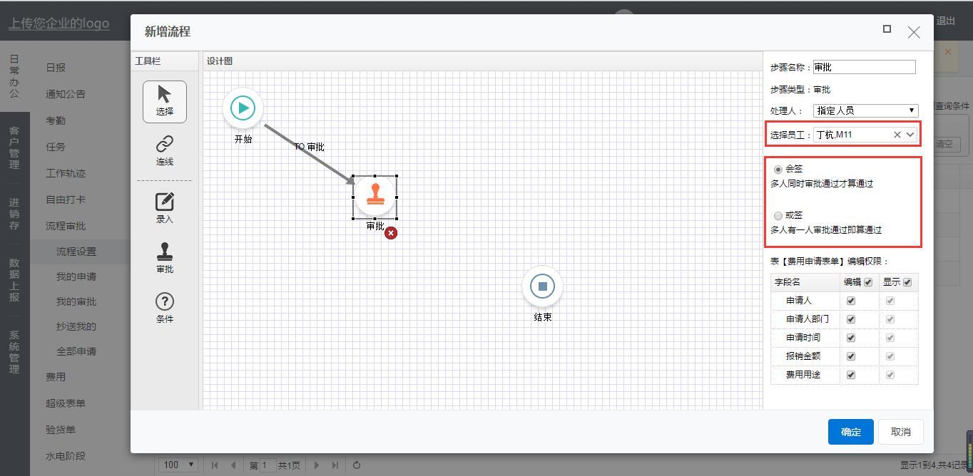 下面介绍一个我们所设置流程没用到的功能:当所指定人员有多人时,我们可以设置会签或者或签,