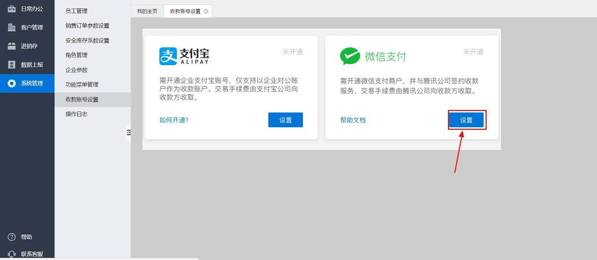 企业开通微信支付后。登录外勤365管理后台,进入左侧【系统管理】-【收款账号设置】中做相应配置(见下图),即可实现车销或抄单销售发货后使用微信支付收款。