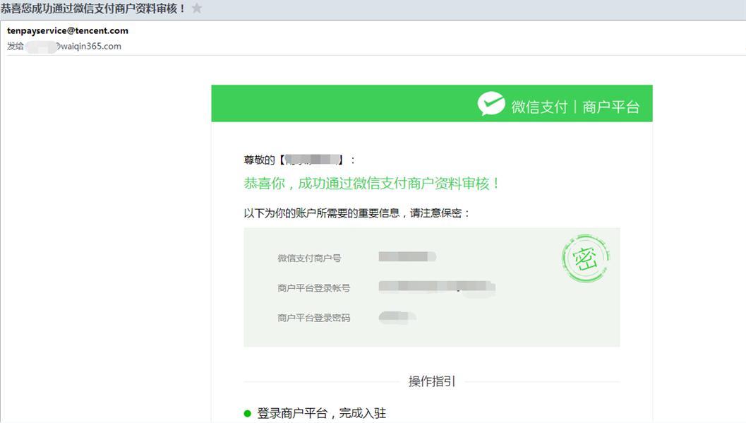 第三步:微信支付审核,审核通过后发送短信和邮件告知企业联系人(在申请时必须录入企业联系人、联系人手机号、联系人邮箱),邮件中包含商户号、登录账号、登录密码,登录地址等。