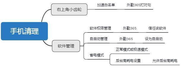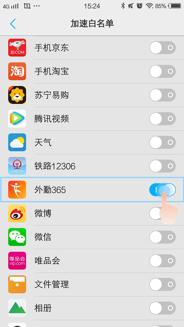 1.选择【手机清理】---右上角【设置】---选择【加速白名单】---找到【外勤365】打开