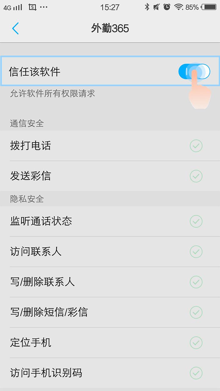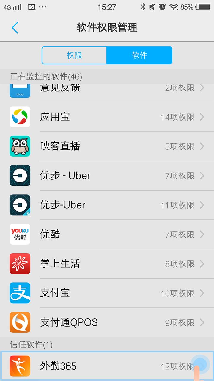 1.选择【软件管理】---选择【软件权限管理】---找到【外勤365】---设为【信任该软件】