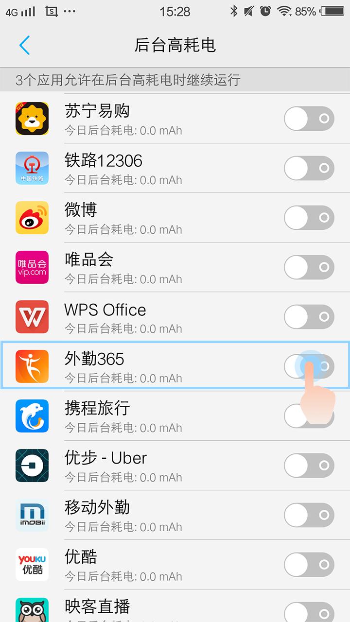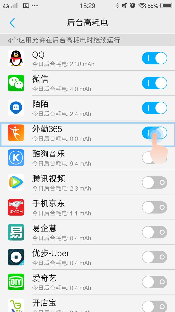 5.选择【省电管理】---【后台高耗电设置】选择外勤365--允许后台高耗电继续运行