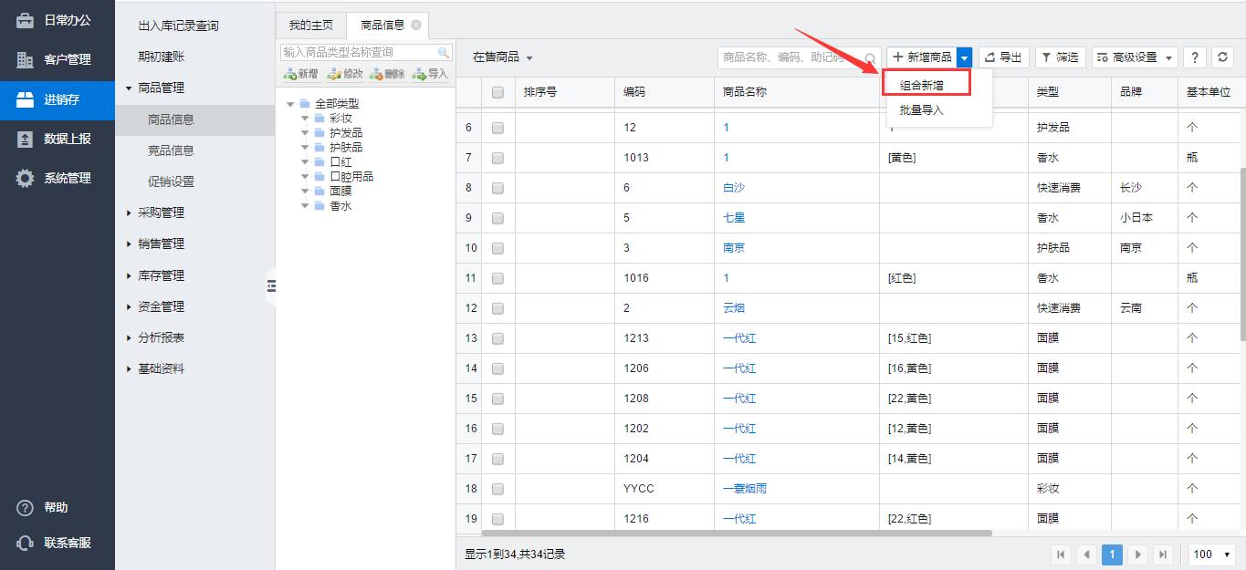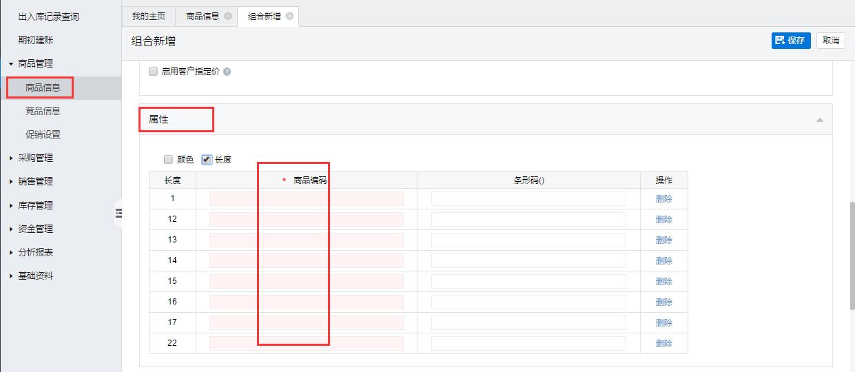 TIPS:选择组合新增,然后勾选一个或多个的规格属性,填好商品编码(不可重复),保存后即可一次性新增多个规格属性的商品信息;