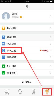 TIPS:(1)点‘我’,选择手机认证;(2)输入手机号码点击下一步,手机上会收到外勤365发送的验证码,输入验证码后提交即可完成手机号码的认证。