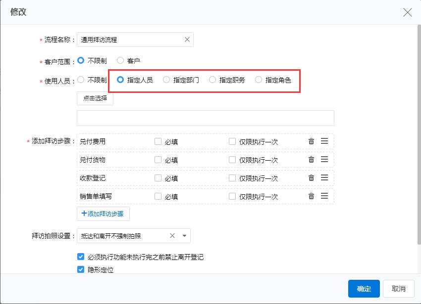 我们公司不同部门的人、不同职务的人去拜访的时候所做的工作内容是不一样的,我就设置了好几个拜访流程,可能他们总是容易选错流程,怎么办?