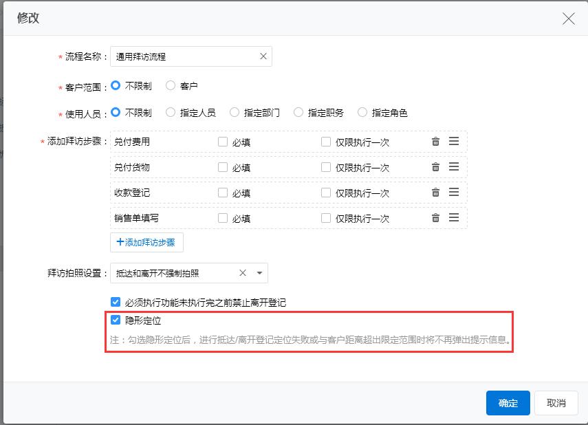 2、勾选隐形定位,手机端操作抵达或者离开时,定位失败或者位置偏差超过限定范围时,将不再提示。